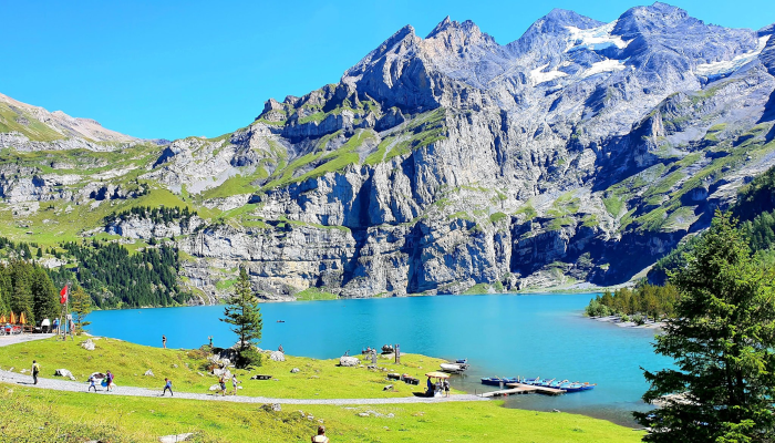 Lago di Oeschinen ai piedi della Blüemlisalp, è uno dei più grandi laghi alpini. Una cabinovia sale da Kandersteg fino alle sue vicinanze: basta infatti una camminata di mezz’ora per pascoli e abetaie per raggiungere il lago, le cui acque in estate arrivano ad una temperatura di 20 °C. I giri in barca a remi o un giro sulla pista per slittini estiva sono attività possibili.